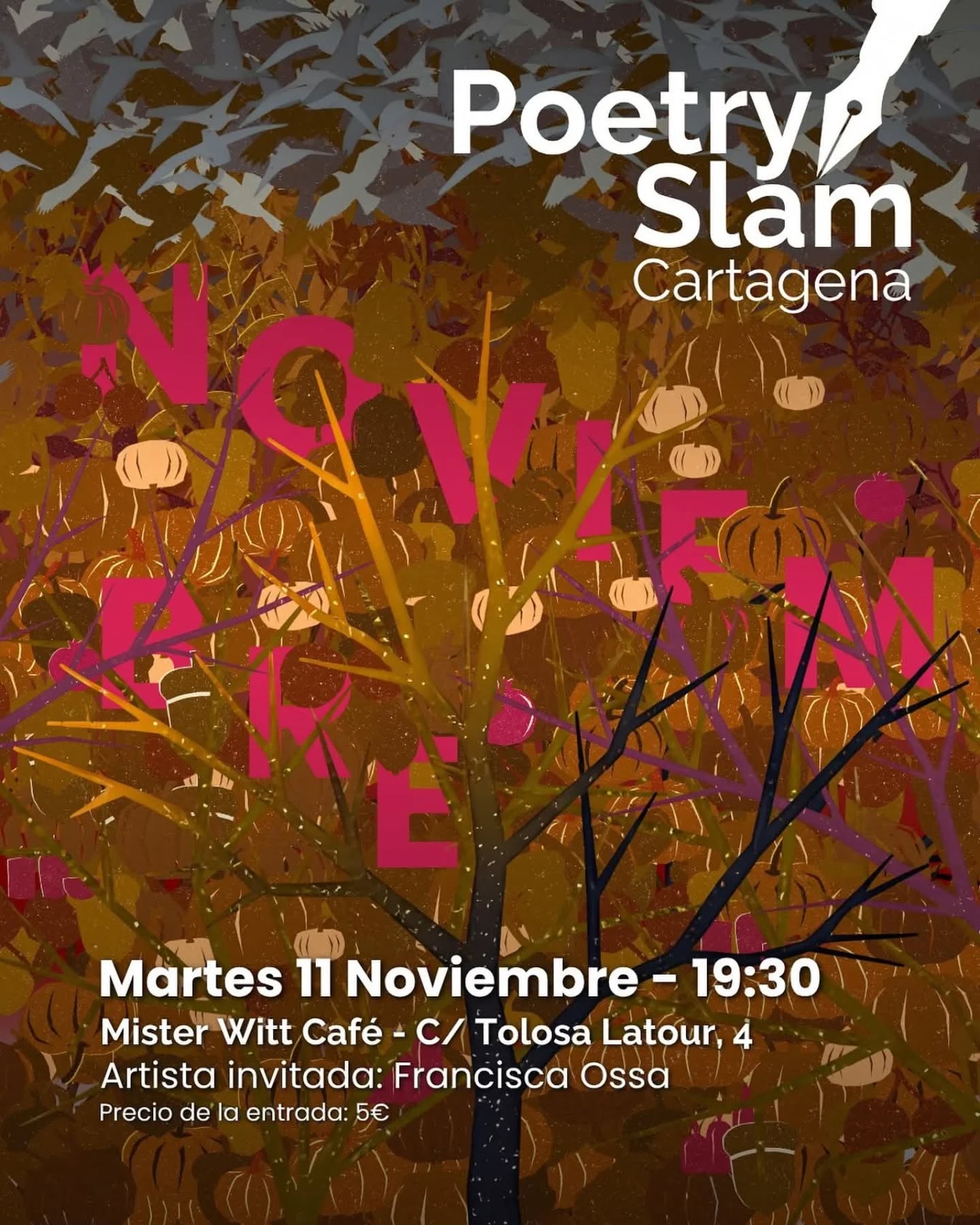 Martes 11 de noviembre a las 19:30, Poetry Slam en Mister Witt Café. Entrada 5Euros. Artista Invitada: Francisca Ossa.